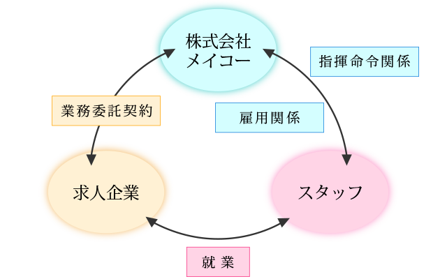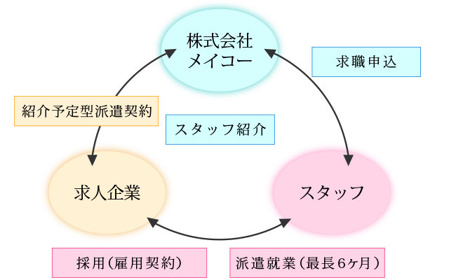 紹介予定型派遣とは、派遣期間が満了した後、その人材を直接雇用(正社員や契約社員、パート等)として採用することを前提として行う派遣スタイルです。派遣先も派遣スタッフも、派遣期間中にお互いを見極めてから雇用成立となるため、ミスマッチを防ぐことができます。